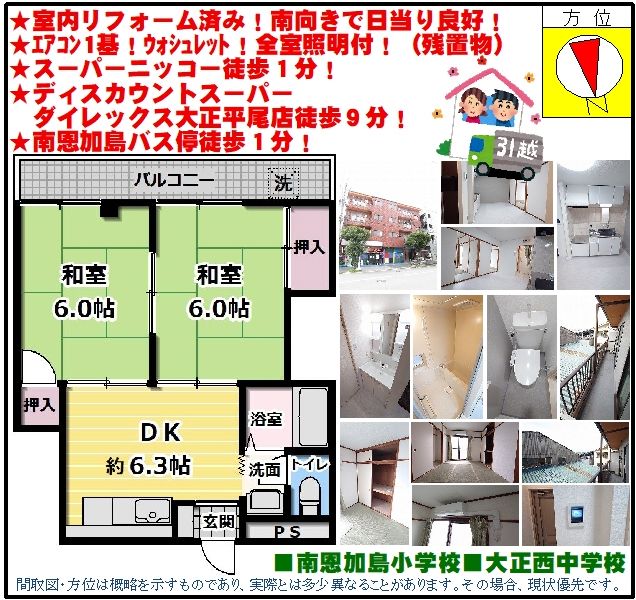 | 交通 | JR大阪環状線・大阪メトロ長堀鶴見緑地線 「大正」駅 バス乗車16分 大阪シティバス 「南恩加島」バス停 徒歩1分 | ||